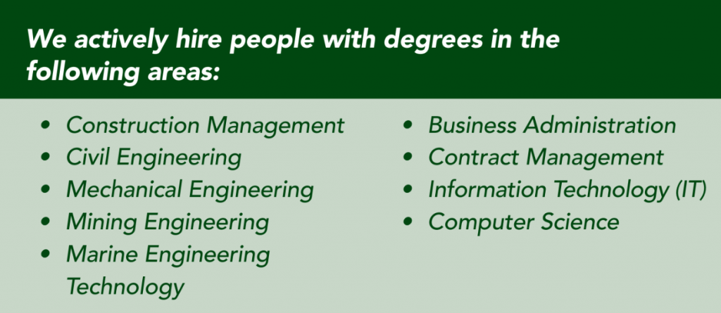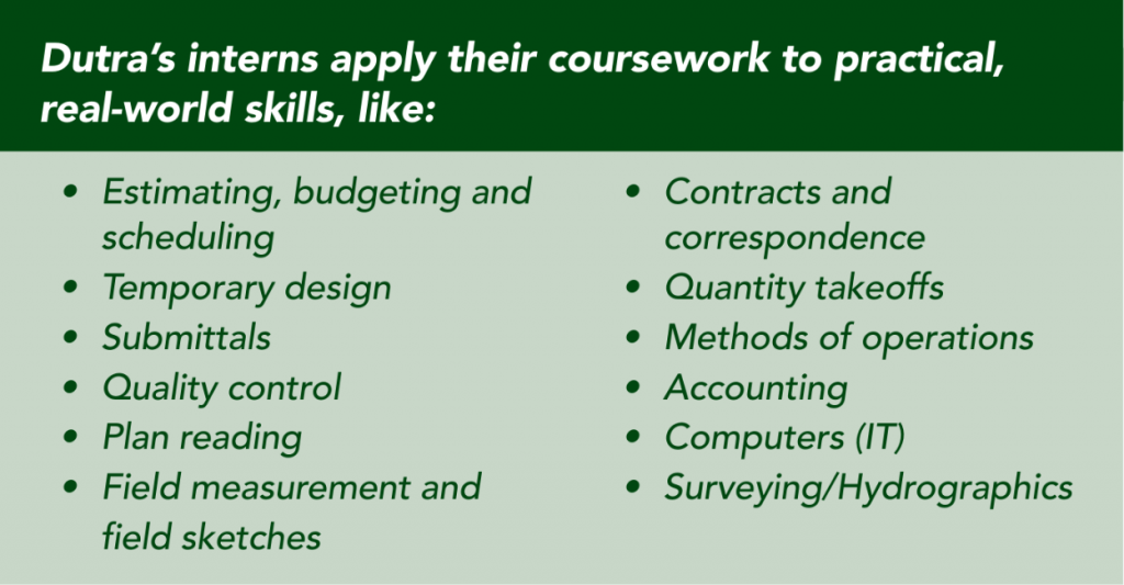 The Dutra Group offers an exceptional paid intership program for civil engineering, construction management, mechanical engineering, marine engineering technology, mining engineering, business administration, computer science and information technology (IT) students at accredited colleges and universities. Working algside experienced professionals – estimators, project engineers, superintendents and project managers – our interns gain invaluable, first-hand experience on a wide range of heavy construction and dredging projects. And we provide our interns with feedback on their work!