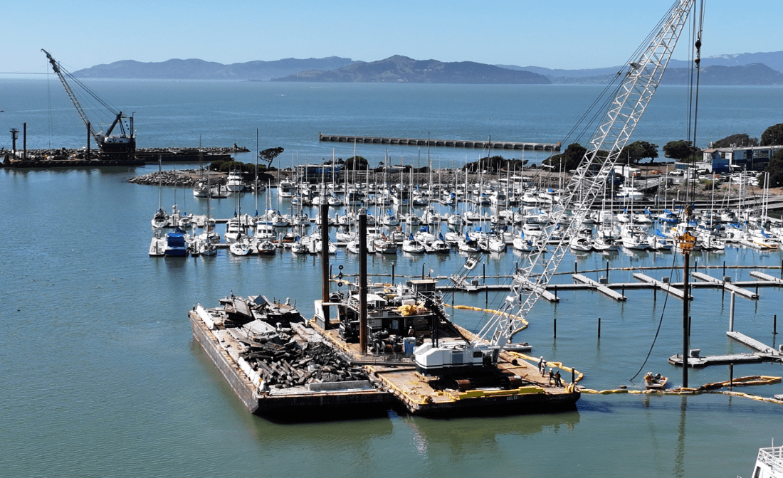Berkeley Marina D & E Docks demolished and dredged, paving way for new dock construction.