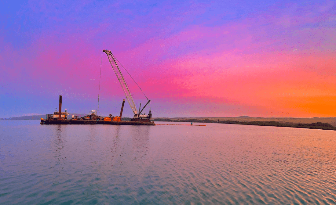 The Dutra Group demonstrated proactive problem-solving in their dredging operations in Maui and Molokai by anticipating and addressing several challenges. They recognized the potential difficulties of remote operations, including logistical issues with personnel, equipment, and supplies. To mitigate these challenges, Dutra conducted multiple pre-project visits to both islands, allowing them to address safety concerns, community issues, and operational logistics well in advance. They also developed a custom underwater barrier system to protect the environment, building a sturdy frame on-site and attaching a flexible curtain to it. This innovative setup helped contain disturbed sediment despite strong winds and rough waters, minimizing the project’s impact on the surrounding marine ecosystem. This foresight and innovative approach enabled Dutra to balance local community concerns with USACE contract requirements while maintaining productivity in the face of weather-related delays and limited resources.