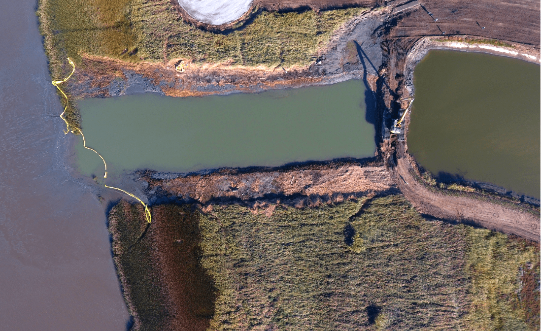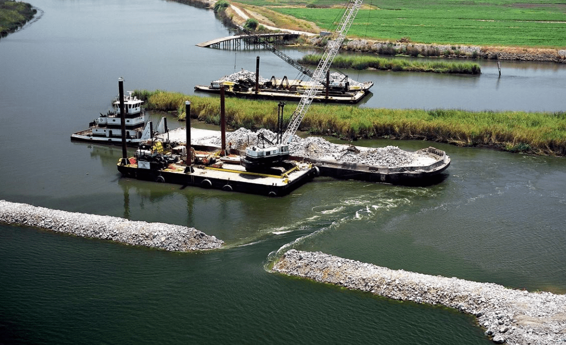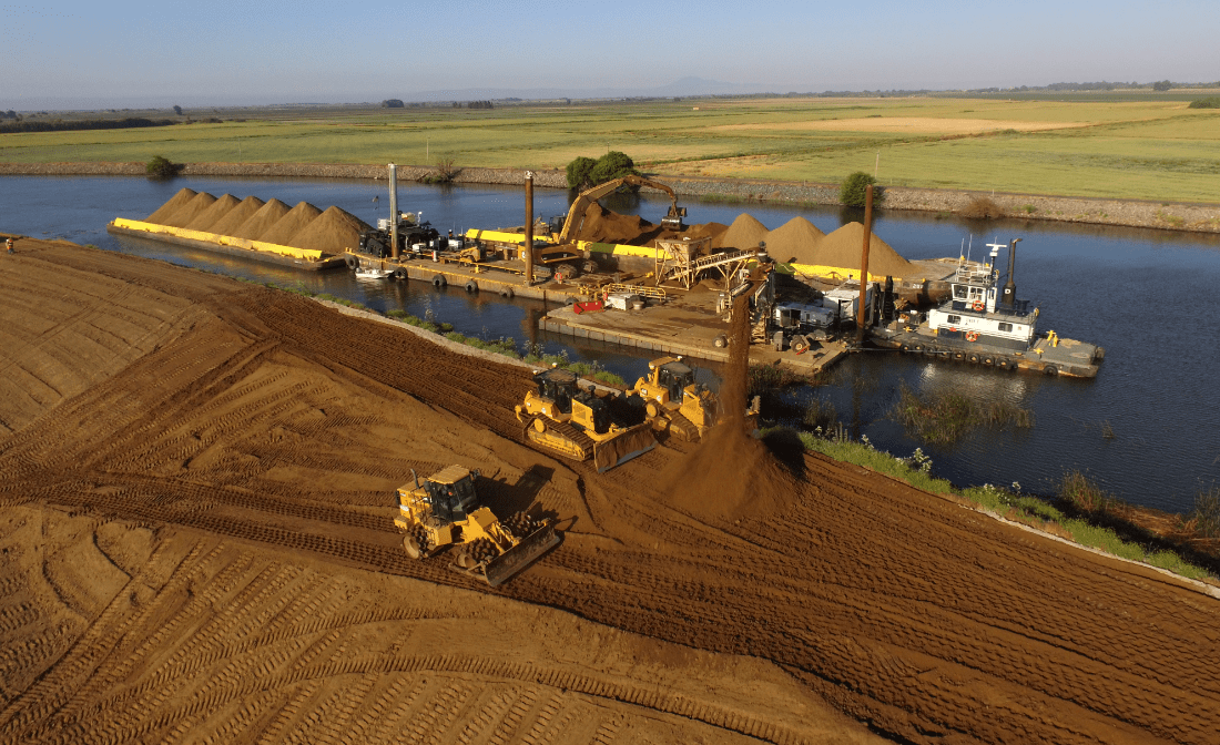 Emergency levee repair: 2,000-ft collapse on Victoria Island stabilized with rapid response and barge support.