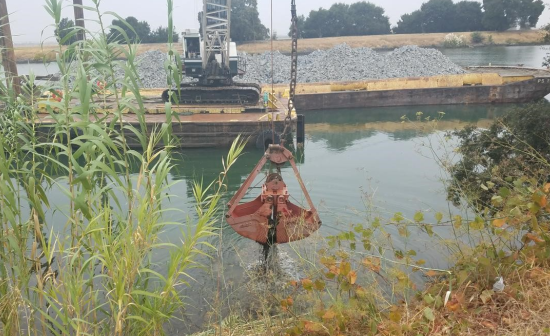 5,400 tons of drain rock placed as levee ballast to prevent slope slippage, hauling by truck from nearby marina.